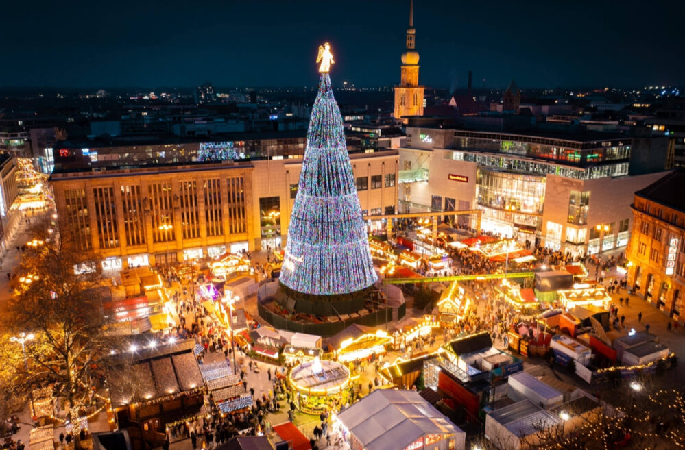 Die Tore der Dortmunder Weihnachtsstadt haben im Jahr 2025 erneut geöffnet, berichtet 4thebike.de mit Verweis auf Augsburger allgemeine. Jährlich zieht der Weihnachtsmarkt in Dortmund zahlreiche Besucherinnen und Besucher an und zählt zu den größten Adventsmärkten Europas. In diesem Jahr findet die Veranstaltung bereits zum 126. Mal statt. Besonders auffällig ist die rund 45 Meter hohe Baumkonstruktion auf dem Hansaplatz, die aus etwa 1.200 einzeln montierten Fichten besteht. Der Aufbau erstreckte sich über vier Wochen, die Baumstruktur wird mit mehr als 138.000 LED-Lichtern beleuchtet und von einer vier Meter hohen Engelsfigur gekrönt.